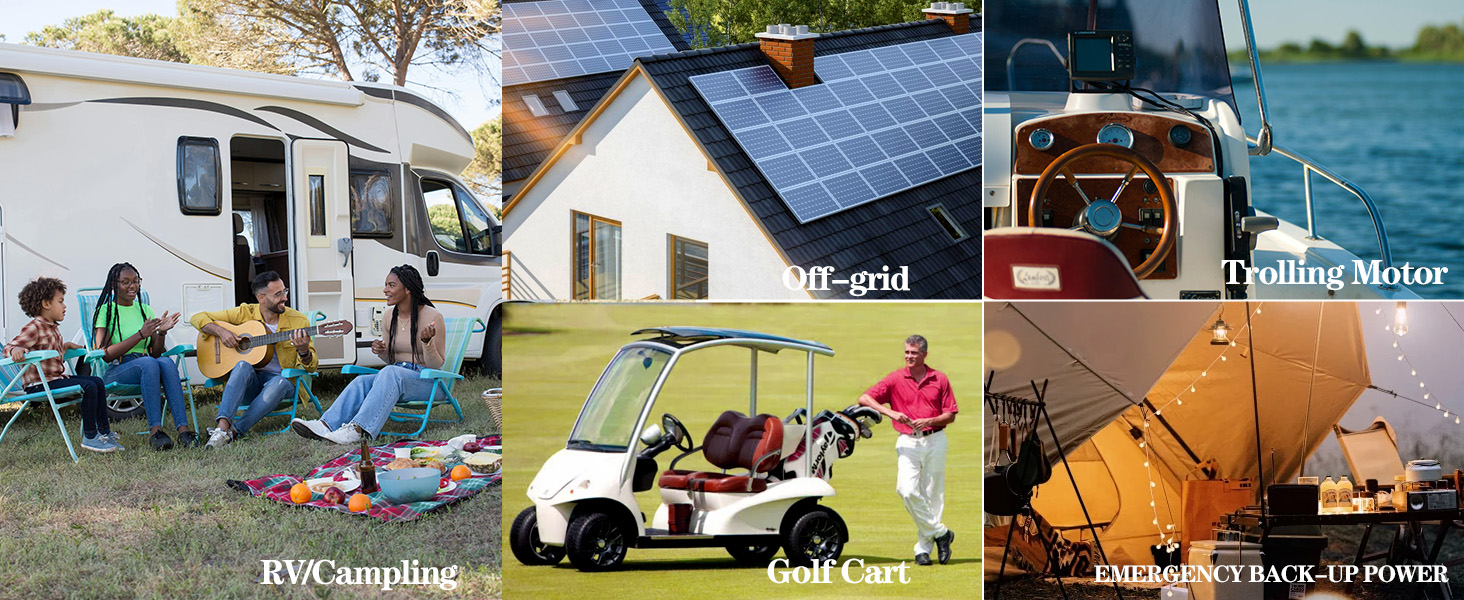 【High Energy Density & Small Volume】We use A-grade cells when producing LiFePO4 battery, which can maximize the advantages of high energy density, small size, and long lifespan of lithium iron phosphate batteries. As you can see, our battery size is smaller than most batteries of the same capacity on the market, and can be suitable for most use scenarios such as RVs, golf carts, and yachts.